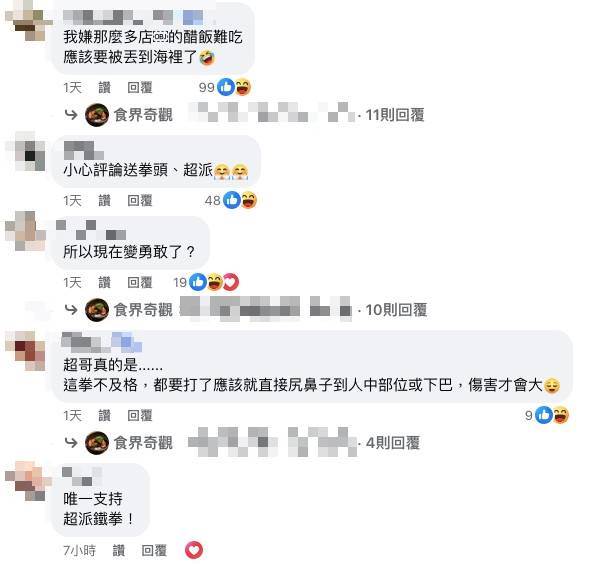 貼文曝光後,一票網友紛紛嘲諷,直呼「小心被賞超派鐵拳」、「你是不是想來碗超哥今晚研發的新菜色:丼手丼腳?」、「評論送拳頭喔」、「謝謝超哥,讓大家知道有錢就可以把人打破頭縫10針」、「飯後甜點送饅頭」、「身為美食評論家學點武功防身也是需要的八」、「醋飯天條」。
