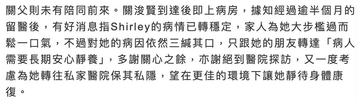 關淑怡的家人沒有透露關淑怡的病情,不過有向友人傳達穩定的消息,也就是說如今關淑怡雖然還在ICU但是情況已經穩定了下來,但是基于還是要長期安心靜養,所以其家人還是不方便接待,謝絕到醫院探望。此外,出于對康復的需求,關淑怡的家人還考慮要為其轉院,從公立醫院轉到私家醫院,如此一來既能提供更好的環境,也能保護個人隱私。關淑怡的家人始終不希望透露更多相關的私人情況,所以至今關淑怡到底是什麼情況被送入院急救的,仍然沒有確切地說法。