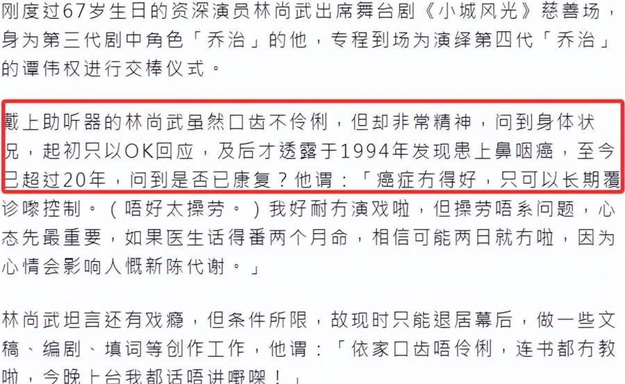 2017年,適逢其67歲生日,他接受媒體采訪的時候表示:癌癥沒有得好,只能長期復診和控制,不要太操勞。換句話說,林尚武帶癌生存已經長達31年,可以說,這31年他是賺得。