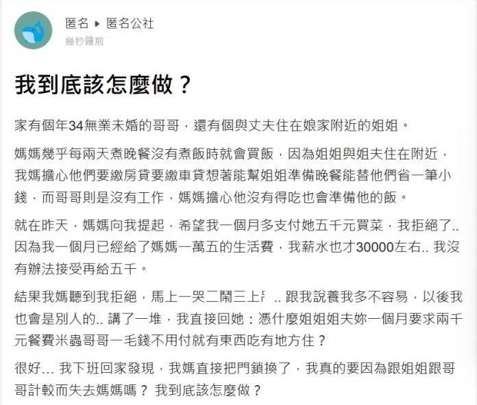 據《ETtoday》報導,近日原PO在匿名公社發文表示,她平時與媽媽、哥哥同住,姊姊則與丈夫住在娘家附近,媽媽幾乎每兩天煮晚餐,沒有煮飯時就會買飯,因為她擔心姊姊要繳房貸、車貸,所以平時只要付2000元餐費,媽媽就會為他們準備晚餐,而34歲的哥哥至今無業未婚,媽媽也因為擔心他沒得吃,所以也會替他準備晚飯。