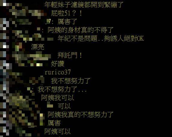 對此,許多網友看了都狂噴鼻血,紛紛表示「我不想努力了」、「阿姨的身材真的不得了」、「阿姨界的極品」、「阿姨比我31歲的女同事還正」、「想跟阿姨切磋技巧,我說的是拍照」、「阿姨我愛妳,我身體和靈魂都賣妳」、「大我快3輪,我還是很可以」。