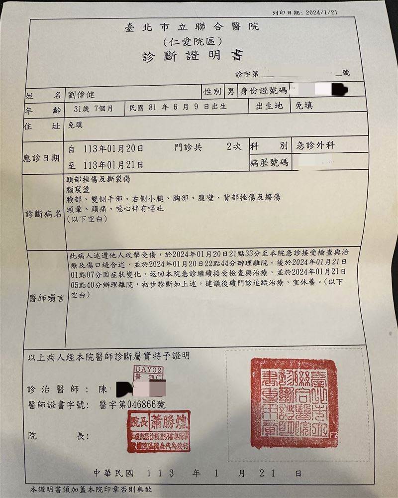 ▲Toyz今(22)天晚間貼出驗傷單。(圖/翻攝自Toyz粉專)